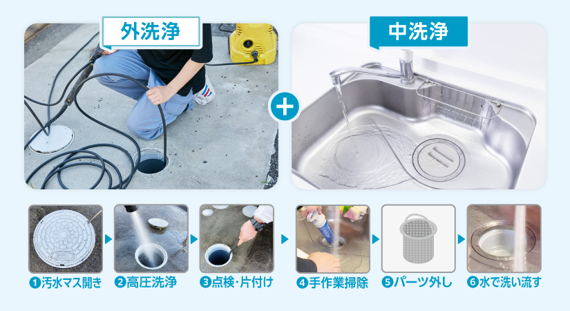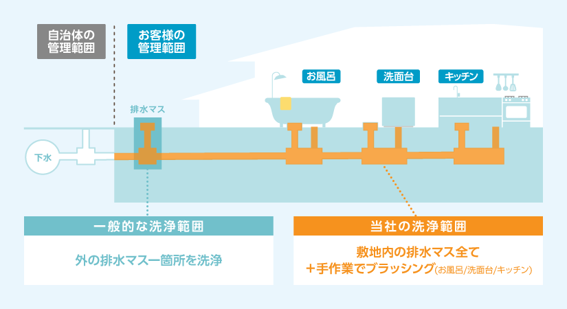 一般的な作業範囲は屋外の洗浄のみですが、私たちは屋外の汚水マスから排水管の奥・屋内の排水管まで、お家一軒丸ごと洗浄します。まずは高圧洗浄機で屋外を洗浄。加えて屋内の詰まりがちなキッチン、お風呂、洗面所の排水管を手作業でお掃除します。