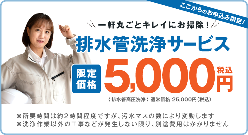 出張料や汚水マスの個数によって別途料金は発生しません。時間をかけてお伺いしようと、汚水マスが何個あろうと、全て含めて限定価格 一律5,000円でお受けしております。作業時間は合計2時間程度、うち屋内作業は約30分ですので休日の合間にご利用いただけます。